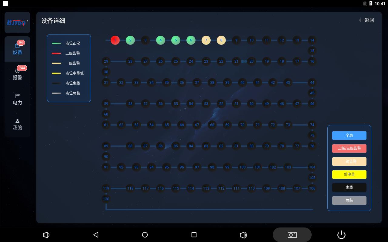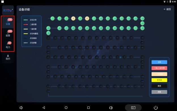 設(shè)備詳情頁實(shí)時(shí)顯示皮帶上保護(hù)裝置當(dāng)前狀態(tài)鏈路圖,分為6種樣色顯示,分別代表保護(hù)裝置正常,保護(hù)裝置保護(hù)裝置二級告警,保護(hù)裝置一級告警,保護(hù)裝置電量低,保護(hù)裝置離線,保護(hù)裝置屏蔽六種狀態(tài)。