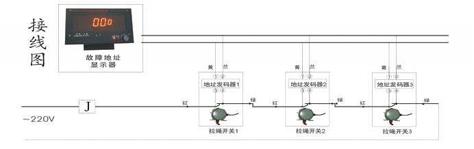 KJT-FSI配合跑偏開關(guān)、打滑開關(guān)、撕裂開關(guān)、拉繩開關(guān)的外置地址碼發(fā)送器,將地址發(fā)碼器裝在防水型鋁壓鑄外殼內(nèi),端子1、2接于通訊線,端子3、4與相應(yīng)設(shè)備之常閉點(diǎn)并接。