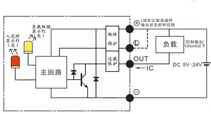 ● “L”引線與“+”引線相接時(shí),輸出狀態(tài)即時(shí)轉(zhuǎn)換如:設(shè)傳感器現(xiàn)態(tài)為受光時(shí)指示燈亮、“out”沒(méi)有輸出電流,相接后指示燈仍亮、但“out”有輸出電流。其它各引腳接線錯(cuò)誤時(shí),傳感器不工作,但傳感器本身不會(huì)損壞;
